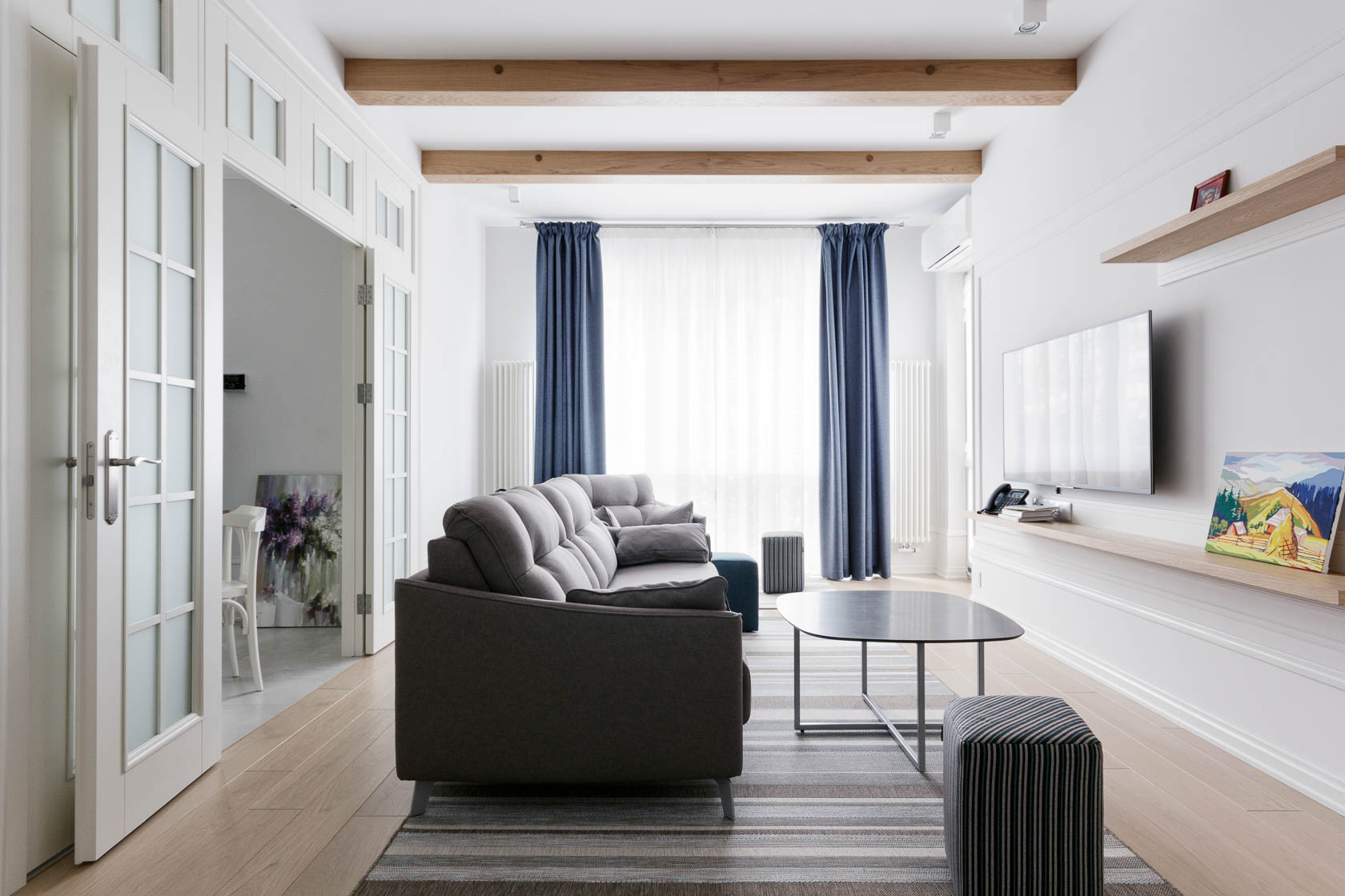 Combination of oak massif and plywood painted in RAL. Matte glass